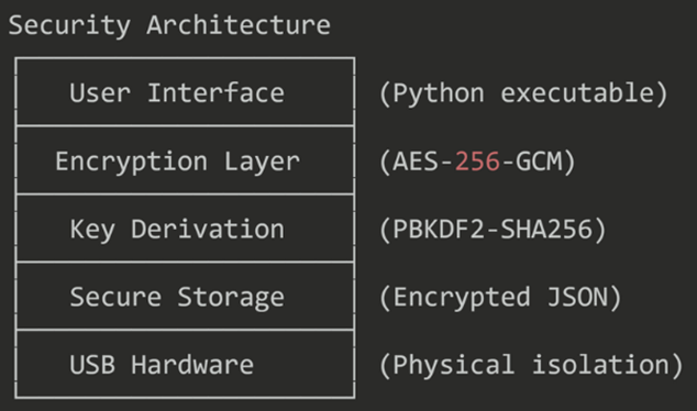 | Time to Hack: Attack Surface: Persistence: Network Exposure: Key Extraction Methods: Successful Hacks: Recovery Rate: | Physically impossible when USB removed 0 bytes on host system None – runs entirely in RAM 0% (USB-only execution) Physical USB theft only 0 (new product) 100% with mnemonic |